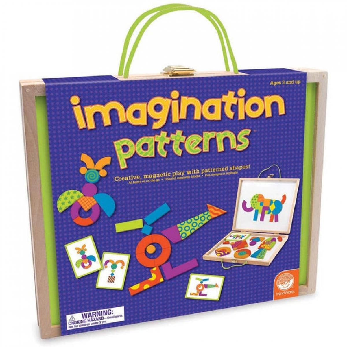Imagination Patterns features a sturdy wood carrying case with durable hinges and rope handles. Inside are 42 brightly-coloured wooden magnetic blocks that can be arranged on the board to replicate any of the 50 full-colour puzzles, such as animals, faces, vehicles, flowers, structures and more. Plus, the magnetic creation surface doubles as a dry-erase board.