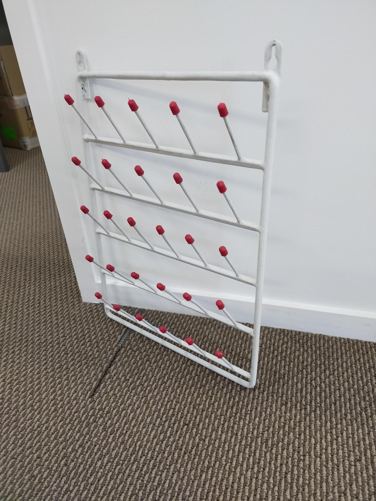 Wall mounted drying rack for 28 test tubes or other glassware such as beakers and flasks.