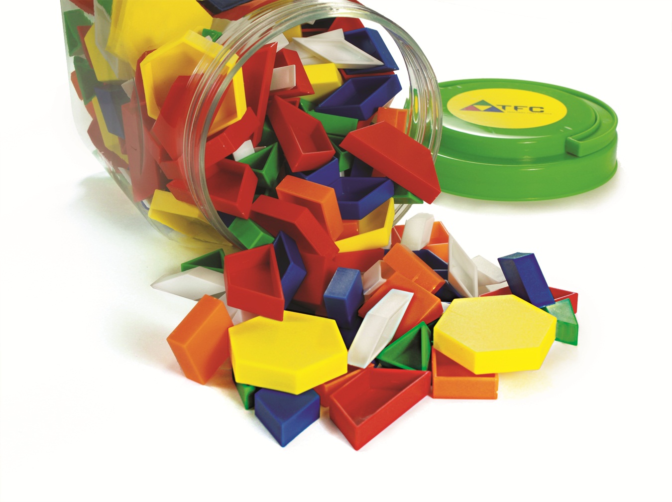trapezoids, blue parallelograms, tan rhombuses). Set contains: 25 x hexagons,