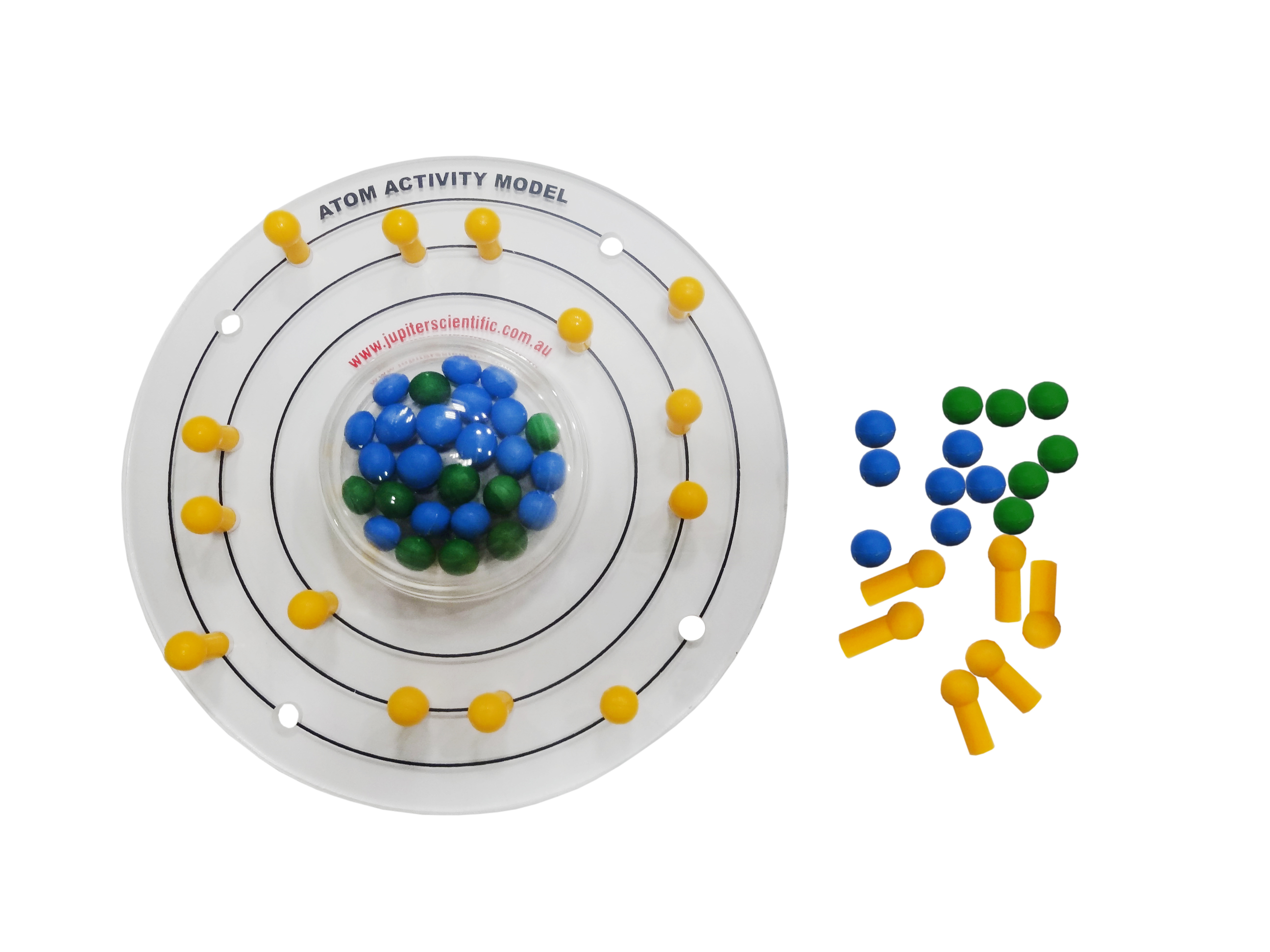 Add or remove neutrons and protons to the nucleus. Peg the required number of electrons in the appropriate shells. A brilliant aid to student understanding of atomic structure, ions and isotopes. Can be used on the overhead projector for easy class demonstration.