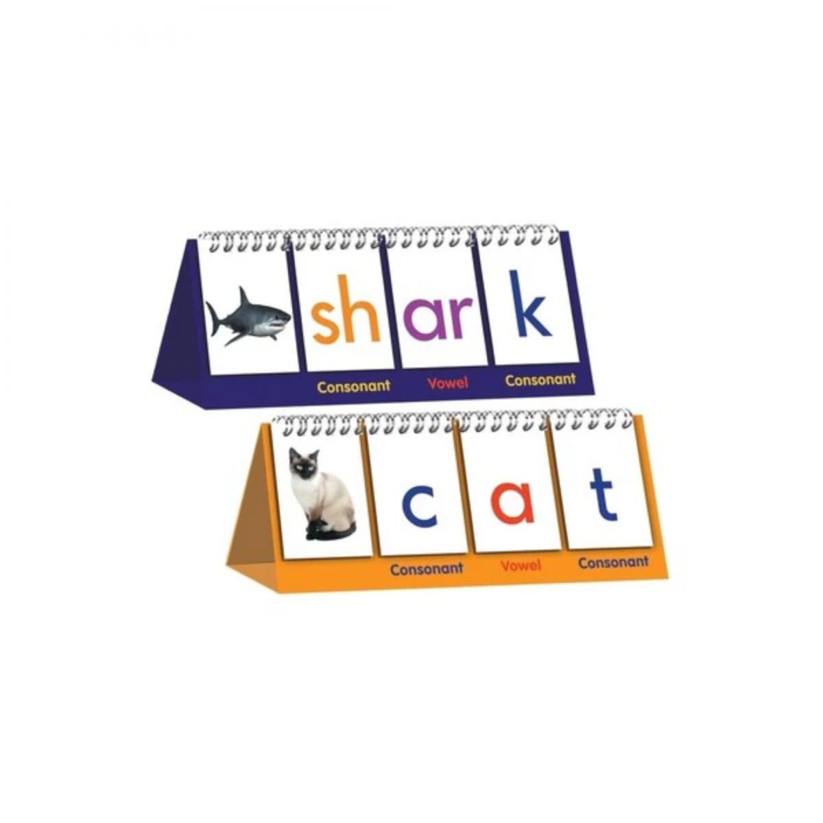 Spelling Flips is a double-sided flip stand that enables students to build new words. On one side are simple CVC words, and on the other are digraphs where two letters make one sound. Picture examples are provided to encourage word building.