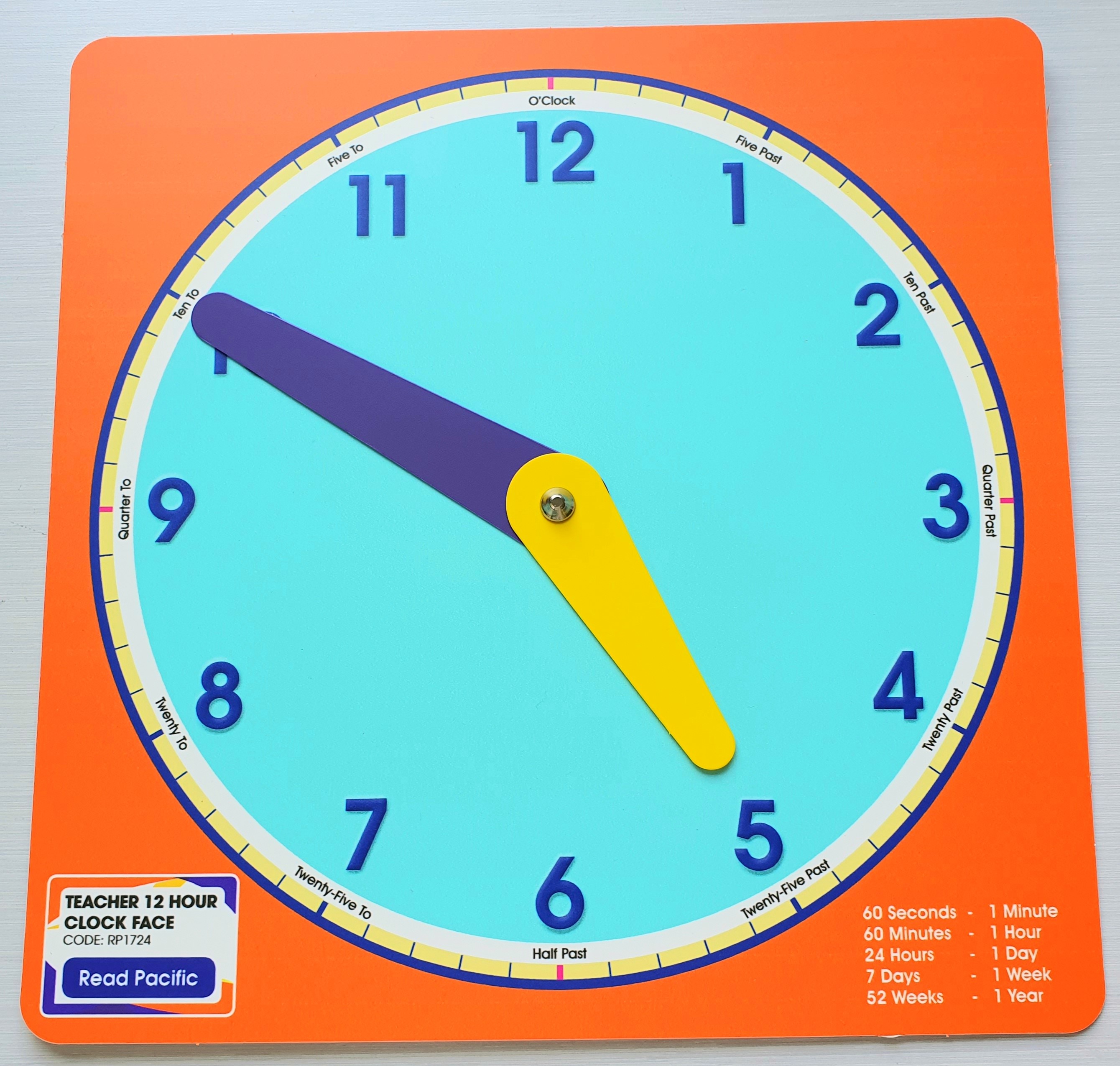 Durable plastic 27cm x 27cm clock face with colour coded plastic moveable hands show hours and minutes.